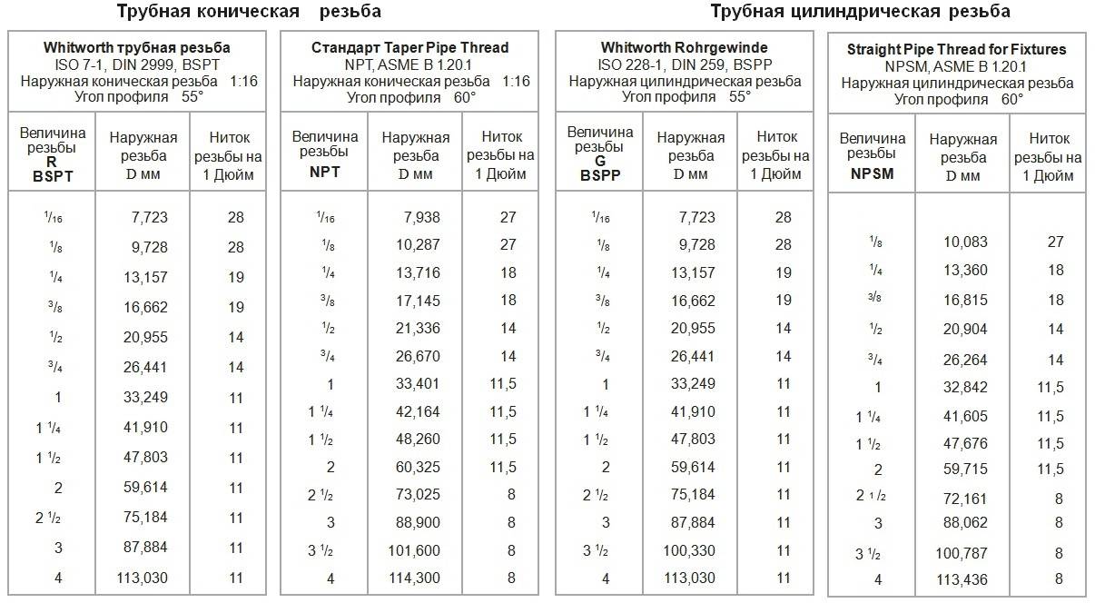 Резьба по стандарту NPT изготавливается в размерах от 1/16 до 24 дюйма. Следует учесть, что такой маркировкой обозначается пропускное сечение полости трубы, а не привычный измеритель — наружные диаметры подключаемых патрубков или штуцеров.