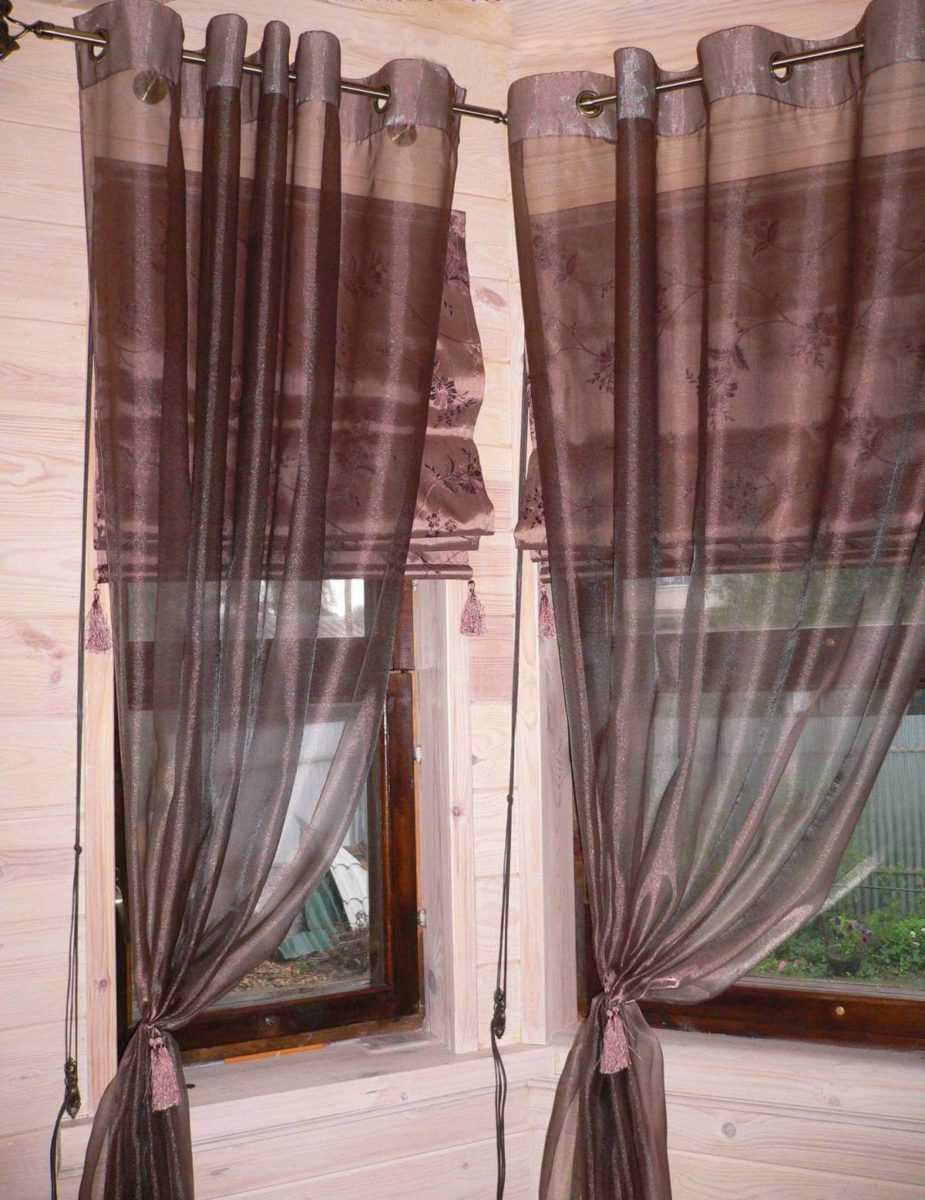 Желательно, чтобы это были натуральные тканевые материалы. Например, плотный лен для римских штор и хлопковый сетчатый тюль для гардин, или сочетание занавесок из плотного и прозрачного шелка.