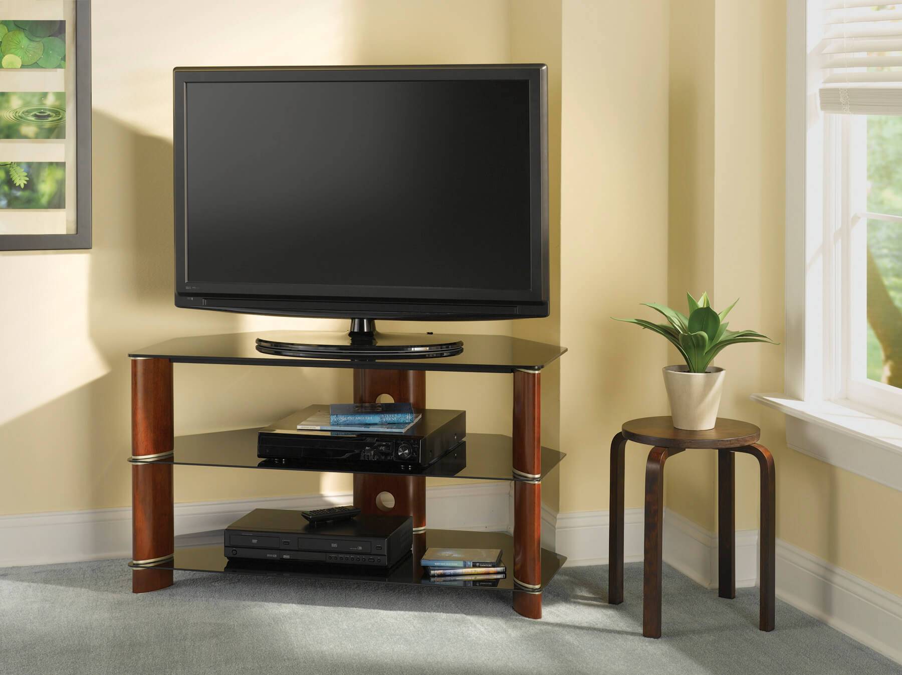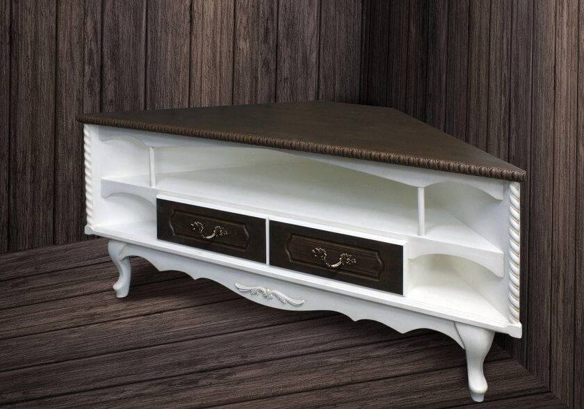 Угловые тумбочки под телевизор. Благодаря своей эргономичности, данный вариант превосходно подходит для комнат с небольшой площадью. Модель является довольно вместительной, однако не требует дополнительного пространства для установки. Полочки, ящики для хранения скрываются чаще всего за распашными дверцами.