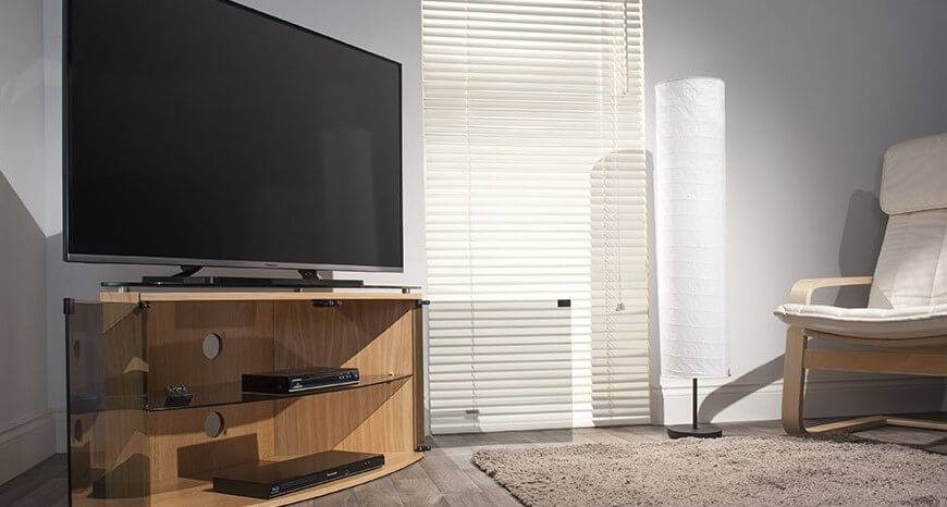 Тумба под телевизор не должна быть слишком высокой — центр экрана обязан находиться в центре наших глаз.