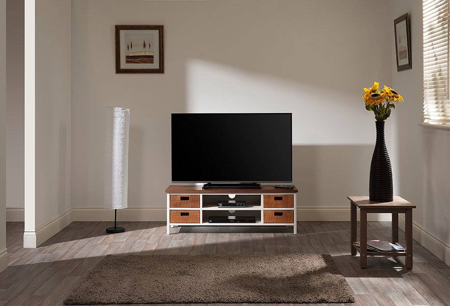 Если говорить о цвете, универсальными принято считать тумбы под ТВ белого и черного оттенков и некрашеные разновидности. Среди недостатков отметим склонность к впитыванию влаги. Повышенная атмосферная влажность приводит в негодность такой предмет.