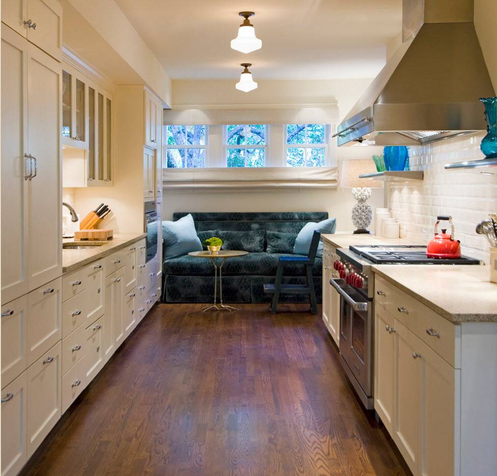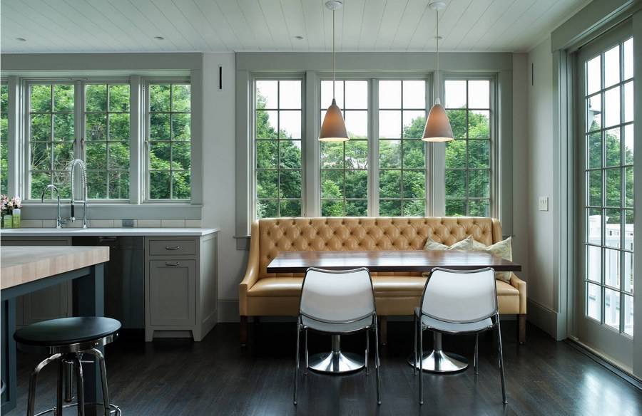 Недопустимо располагать диванчик также около мойки, посудомоечной машины, других бытовых приборов, которые могут обрызгать обивку. Самым лучшим местом является противоположная стенка от кухонного гарнитура. Если же телевизор закреплен на кухонной части, то можно установить софу напротив.