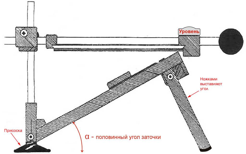 Между тем еще 2-3 года назад в одном из китайских журналов по техническому творчеству мелькнула доработка Apex’а для заточки, не уступающей таковой на фабричном электрическом заточном полуавтомате. Переделка не сложна, см. рис: штангу выставляют горизонтально по уровню и по нему же горизонт штанги держат, ведя заточку. В пределах угла поворота штанги в горизонтальной плоскости 10-12 градусов вправо-влево погрешность угла заточки менее 1 градуса. Если вынос точки касания от 250 мм, точить возможно стамески и железки рубанков шириной до 120 мм.