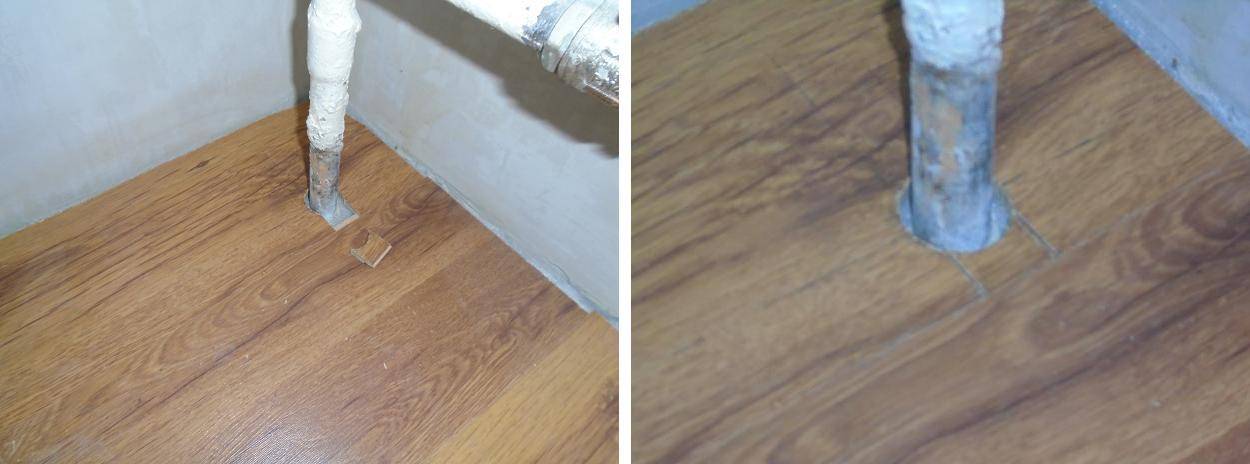 Еще одна проблема, с которой можно столкнуться – это стояки отопления. В этом месте первый ряд придется разрезать, предварительно просверлив в нужном месте отверстие для стояка. Разрезать ряд необходимо четко посередине высверленного отверстия. Так, по крайней мере, рекомендуют производители, но на практике первый ряд ламината лучше подогнать таким образом, чтобы напротив стояка получился стык пластин, в котором на необходимом расстоянии от стены высверливается отверстие. В итоге получается цельный ряд, и нет никаких смещающихся кусочков.