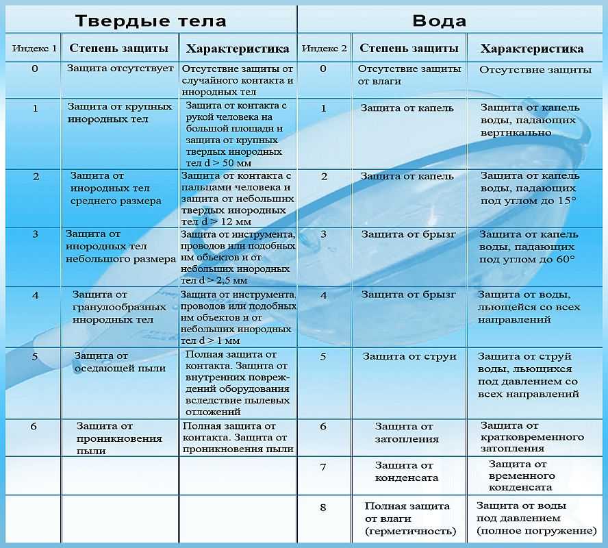 На улице необходимо устанавливать особые пыле-влаго защищенные светильники. Степень защищенности корпуса отображается классом безопасности. Он обозначается латинскими буквами IP и двумя цифрами, которые идут за ним. Первая цифра отражает степень защиты от попадания пыли, вторая — влаги. Чем меньше число, тем ниже защита. Например, IP 44 , имеет более низкий класс защиты чем IP 65. Конкретная расшифровка значения каждой цифры приведена на фото ниже.
