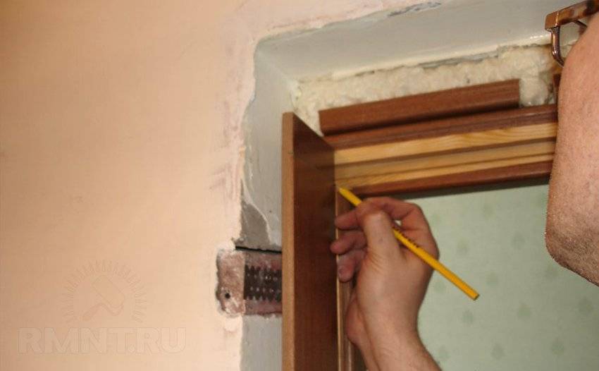 Как прикрутили, вставляем в дверной проем. На верхнем доборе ставим метку по пазу коробки, чтобы еще раз убедится, где именно нам крепить вторую сторону. Снимаем и проделываем те же манипуляции что и с первым, только ставим теперь добор по этой метки. Если измеряли проем точно, то все совпадет, так как было отпилено. Просто лишний раз убедится в правильности своих действий, ни когда не помешает.