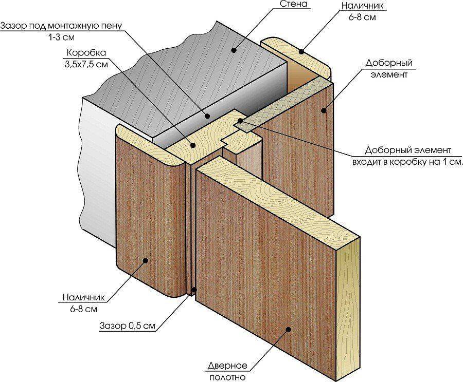 Как правило, дверная коробка имеет небольшую ширину брусьев, и при установке часто не удаётся закрыть всю толщину проёма, поэтому коробка устанавливается с доборами. Они являются продолжением коробки и подразделяются в зависимости от способа крепления на простые или телескопические модели. Телескопические варианты являются более современными и удобными, так как соединяются с коробкой и наличниками с помощью специальных пазов.