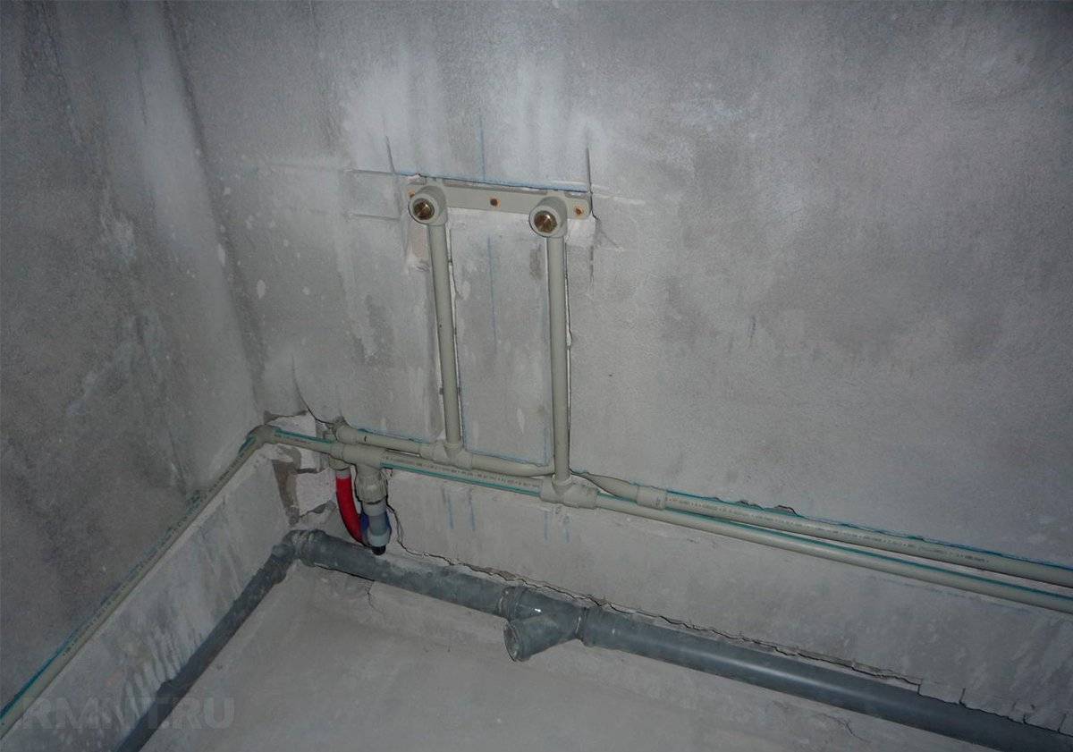 Наиболее простой установка смесителя становится при выполнении водопроводной сети на полипропилленовых трубах. В ассортименте фитингов для них имеются изделия, в которых две МР-муфты жёстко закреплены на планке с выдержкой межосевого отверстия. В таком случае остаётся лишь просверлить планку насквозь и закрепить её к стене дюбелями быстрого монтажа. При разводке металлопластиковыми или PEX трубами фитинги придётся крепить вручную, например на сгустки алебастра.
