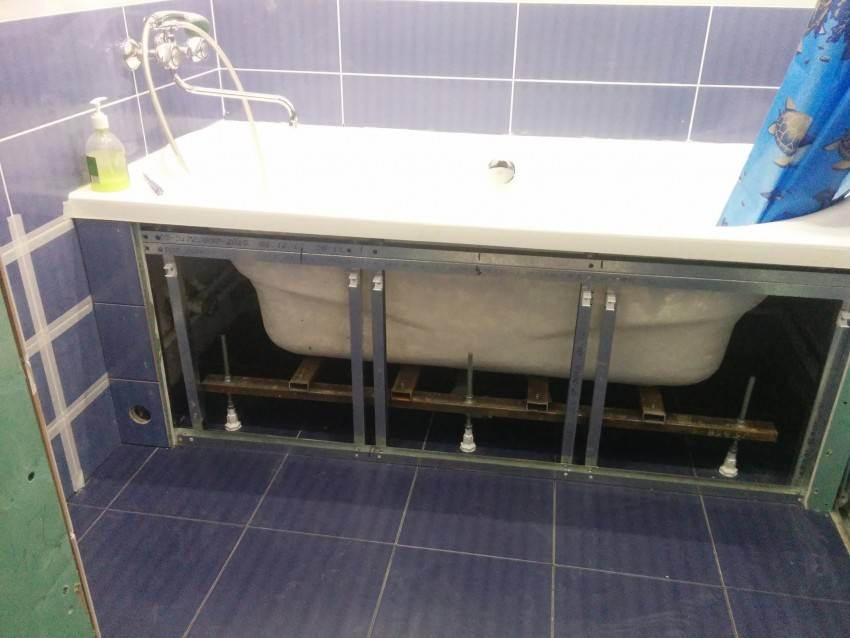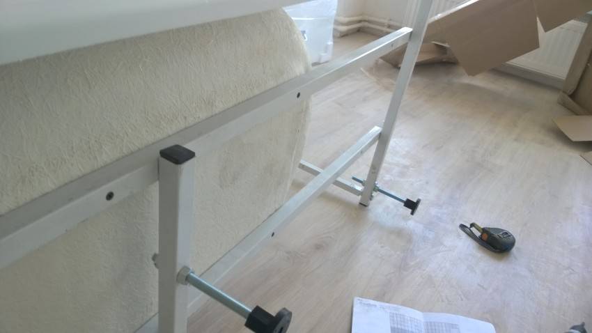 Каркас в себя должен включать следующее: рамку по всему периметру борта ванны в независимости от ее формы. К такой рамке по углам и к самым длинным сторонам посередине приварены опорные стойки с регулировочными ножками. Также обязательно должны быть как минимум две опорные планки под саму чашу.