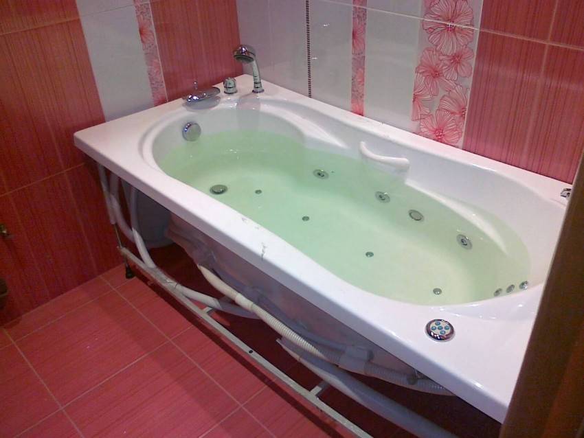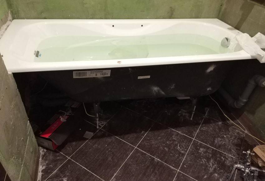 - когда затвердевание окончилось, устанавливаем ванну на каркас и подводим все коммуникации.
