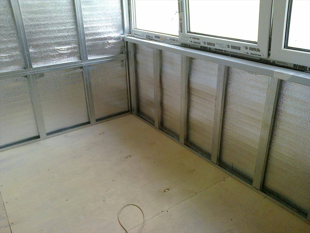 Утепление наружных и внутренних стен на лоджии начинается с установки каркаса. В ячейки укладывается утеплитель, поверх которого закрепляется пароизоляционная пленка.