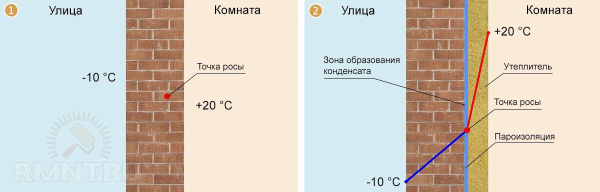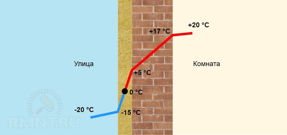 Это означает, что там, где в многослойной стене будет такая температура, влага из воздуха может превращаться в воду и выпадать в виде конденсата.