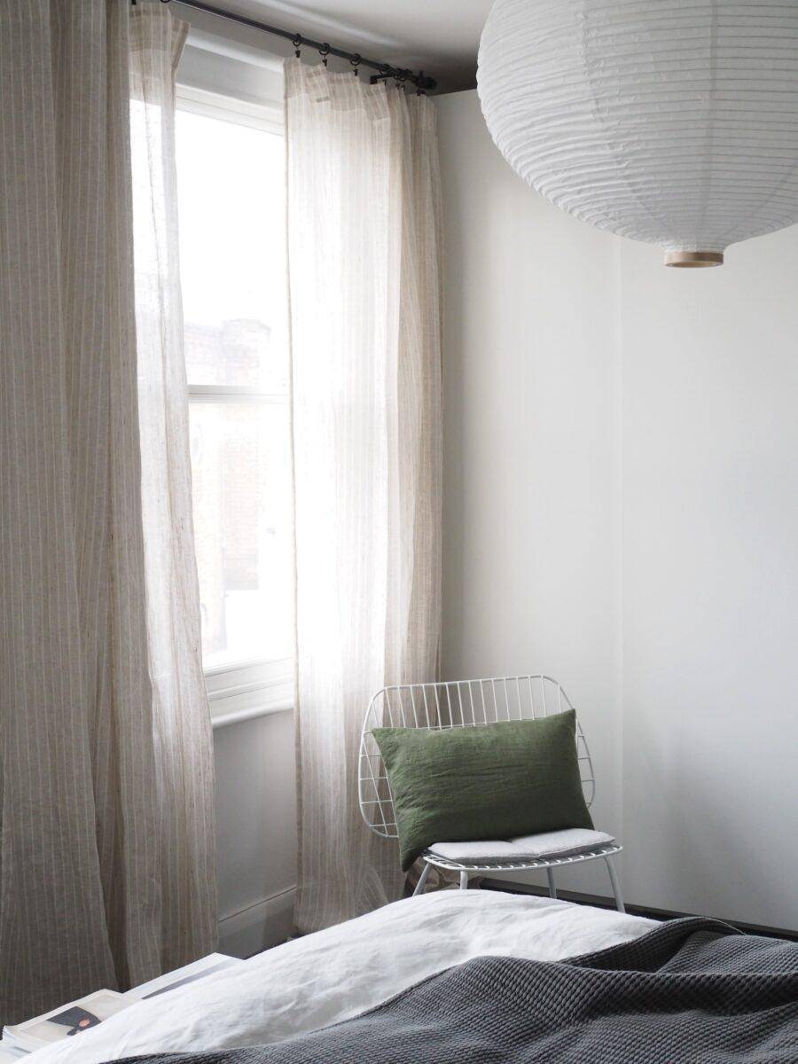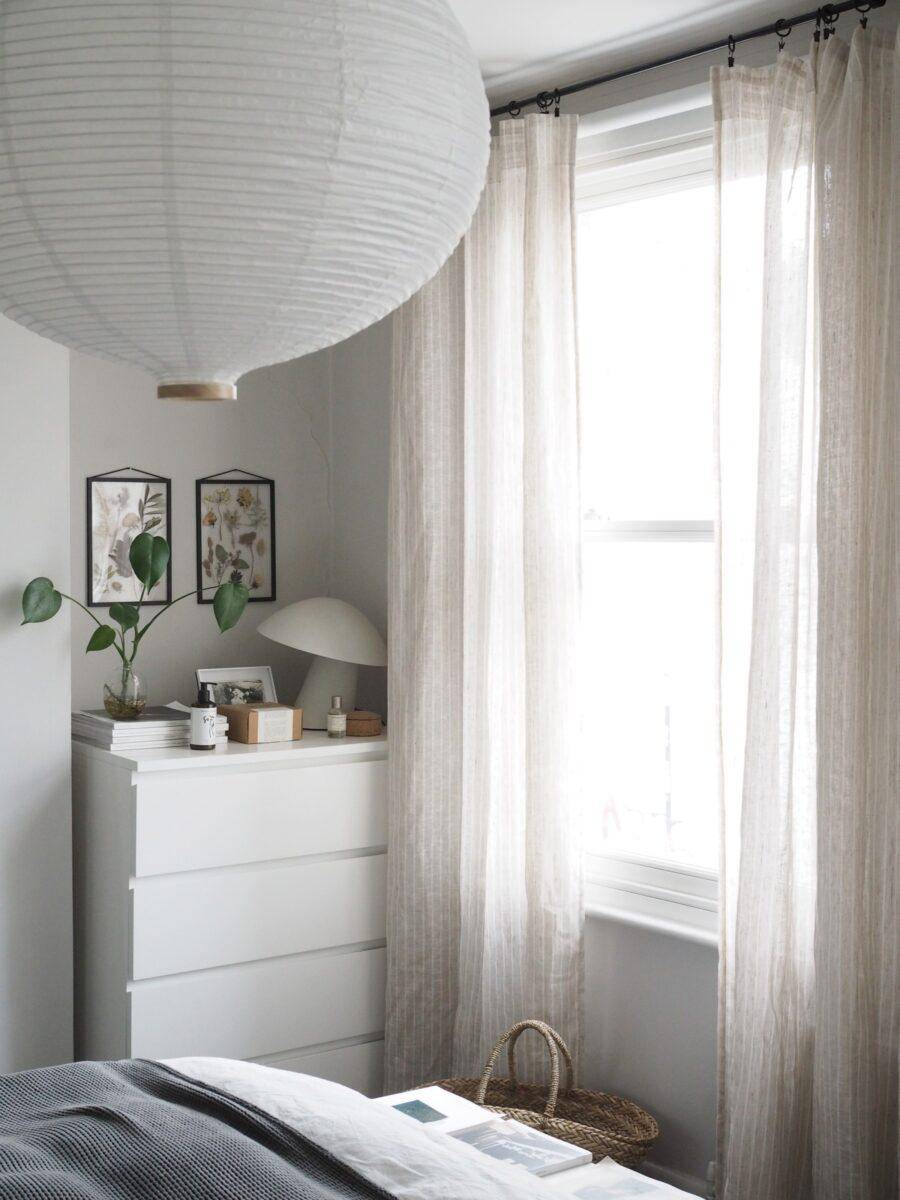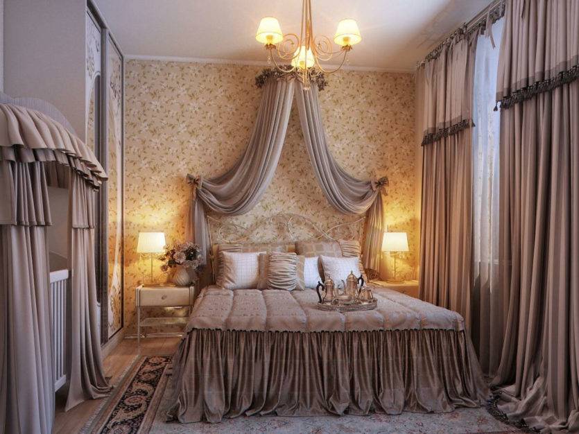 Для спальни важно подобрать плотные занавески, которые будут надежно защищать комнату от яркого солнечного света из натуральных тканей, к примеру, льна или хлопка. А вот от балдахина над кроватью необходимо отказаться, так как он сделает комнату визуально еще меньше