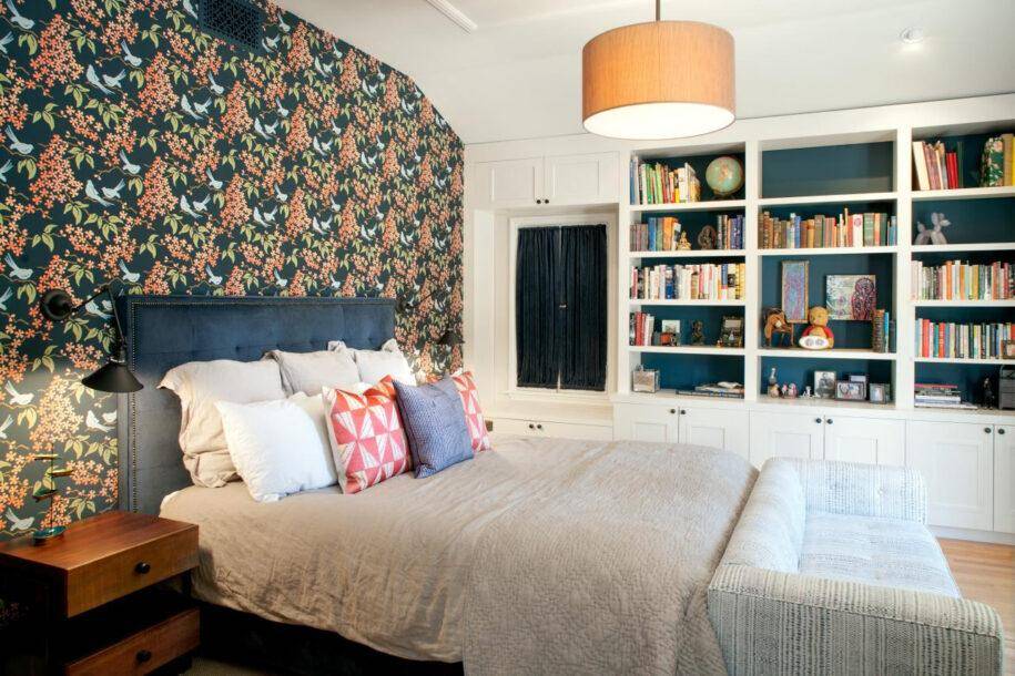 Здесь важно заполнить пустоту в кроватном изножье. В зоне можно поставить мини скамейку, на которой будет удобно переодеться ко сну и бросить домашнюю одежду
