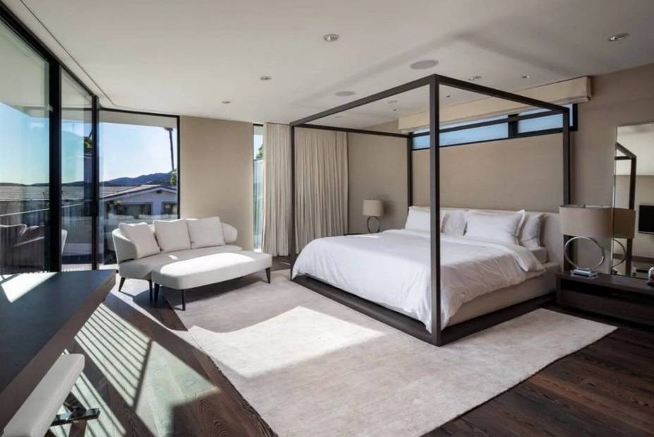 Спальня в особняке имеет выход на задний двор. Рядом со спальней располагается гардеробная комната.