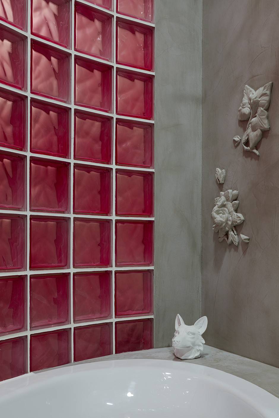 Как же выйти из положения? Ломать стены совсем не хотелось… И дизайнер нашла решение проблемы: предложила сделать полукруглые стенки для санузлов из полупрозрачных стеклоблоков нежно-розового оттенка. Таким образом в квартире и появились комната с ванной, а также санузел с душевой и туалетом. И это оказалось необычным и выигрышным решением, добавившем изюминки интерьерам.
