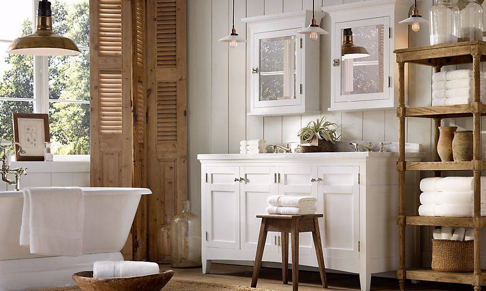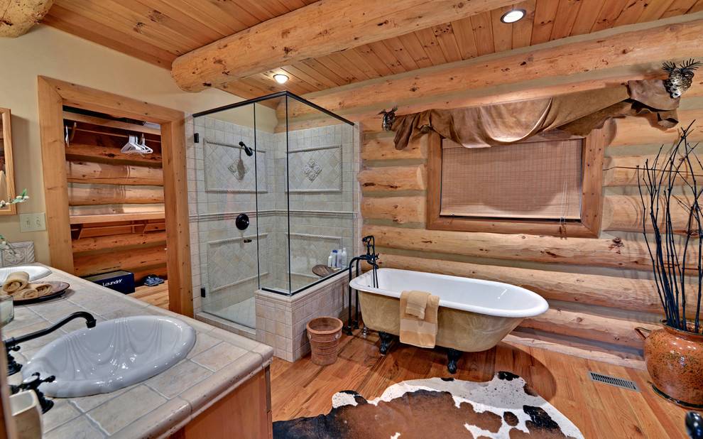 В деревянном доме можно сделать оригинальную ванную в стиле кантри. Стены из темного дерева, пол, выложенный плиткой и каменная раковина позволяют наслаждаться натуральными материалами в интерьере и ощущать себя частью природы.