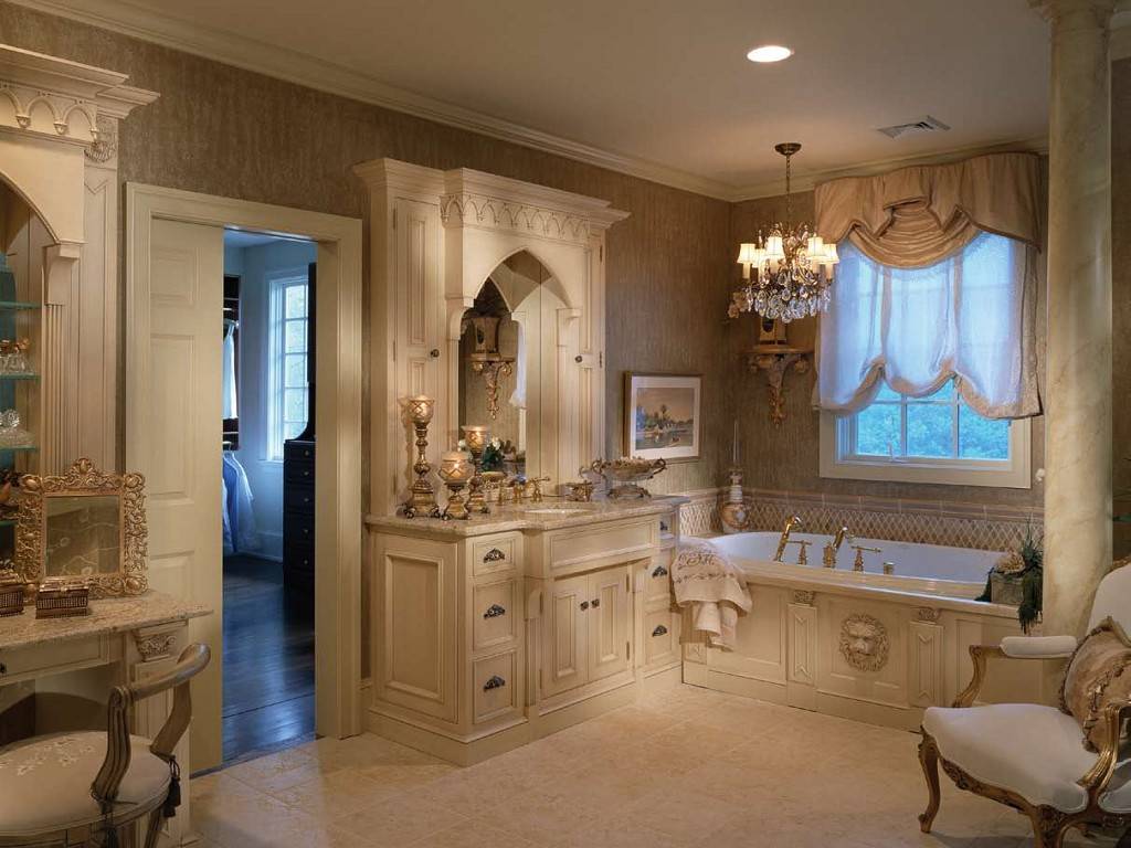 Ванную в стиле ампир или рококо оформляют в роскошных домах, где бюджет позволяет выделить на ремонт значительные средства. Блеск в каждой детали, позолота, небольшие скульптурные фигурки нимф или ангелочков. Прекрасно впишется большое зеркало в позолоченной раме, витые дорогие торшеры, люстры, отдельно стоящая ванна на изогнутых ножках. Сочетание золотого и белого цветов подарит комнате поистине шикарный вид.