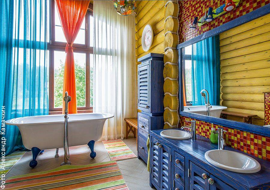 Особое внимание при обработке следует уделять местам, где нарушена естественная структура дерева: торцам, замкам, поперечным срезам. Именно там поглощение влаги происходит наиболее интенсивно. Колоритная ванная в коттедже от ПСГ «Вятский Дом»