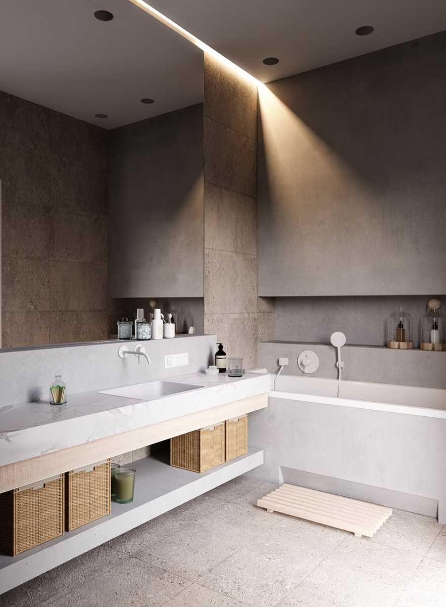 Характерны также плитка с имитацией бетона и однотонный кафель нейтрального цвета (белого, серого, черного). Часть стен можно окрасить. Для этого отлично подойдет краска серого цвета.