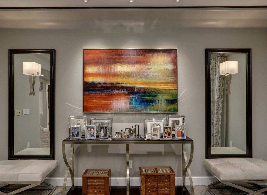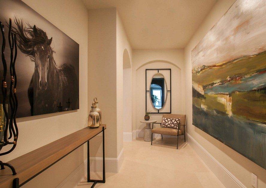 Не менее важно при обустройстве большой прихожей использование декоративных элементов: картины, постеры или семейные фотографии, статуэтки