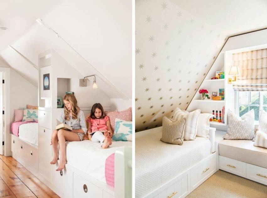 Спальня не обязательно должна быть строго для взрослых. Детям наверняка очень понравится жить в необычной комнате под самой крышей. Детские кровати лучше расположить на расстоянии, чтобы у детей было личное пространство. Если вы хотите сделать наверху именно детскую комнату, вам следует позаботиться об удобной и безопасной лестнице, а также придумать интересный и простой метод коммуникации с ребенком, особенно если ваша спальня расположена в другом углу дома. Например, купите настоящие рации – детям понравится переговариваться с вами в стиле шпионских детективов, и они всегда смогут позвать вас, если им стало страшно во время грозы.