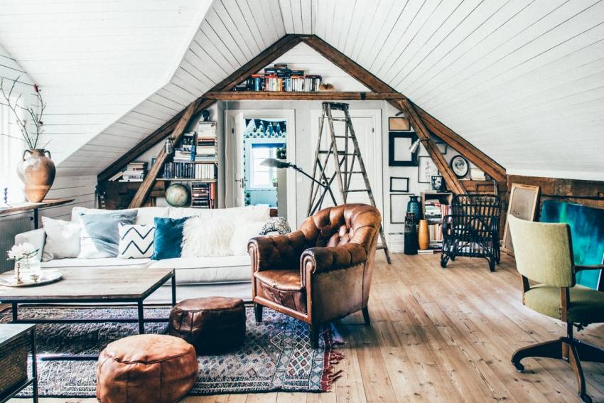 Для чердака не обязательно покупать новую мебель — можно использовать старые стулья, пуфы, диваны и другие элементы