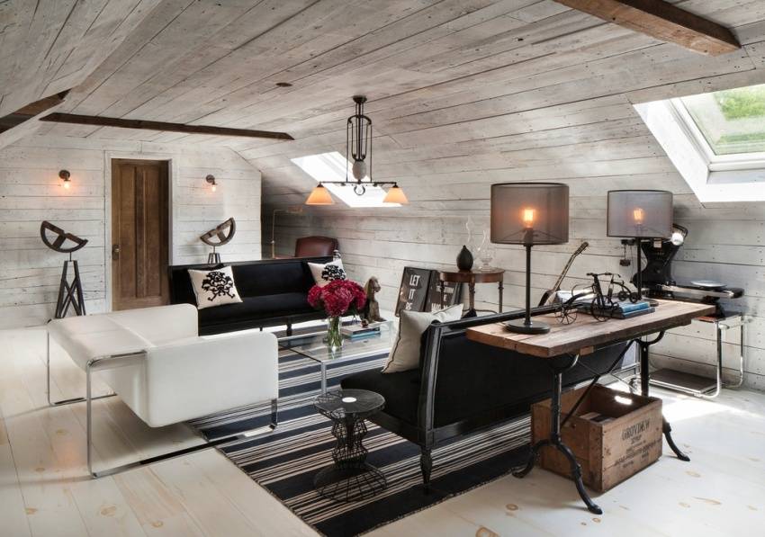 Эффектное сочетание черной и белой мебели в мансардной гостиной