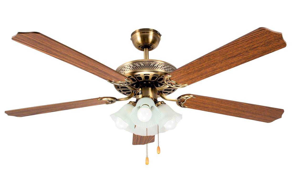Российская модель с габаритами 1320 x 1320 x 450 см и мощностью 300 Вт стоит 10 850 руб. 5 лопастей с диаметром 52 дюйма. Хорошо охлаждает номер, при этом встроенные 4 лампочки, помещенные в белые светильники, отлично освещают. Стальная арматура выполнена в античном стиле. Лопасти изготовлены из МДФ. У них два цвета. Это с одной стороны дуб, с другой — дуб плюс цвет соломы. Управляется модель вручную. Оснащена монтажным кронштейном, штангой с полусферой, при потолочным колпаком. Все это образует систему крепления вентилятора к потолку.
