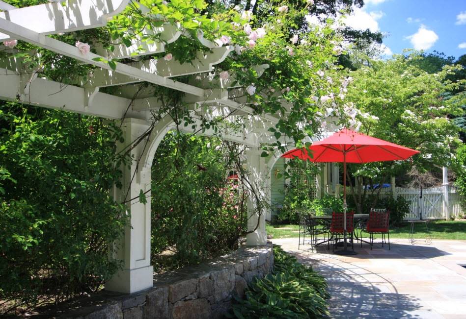 Беседка и пергола, расположенные в парковой зоне возле искусственных водоемов.