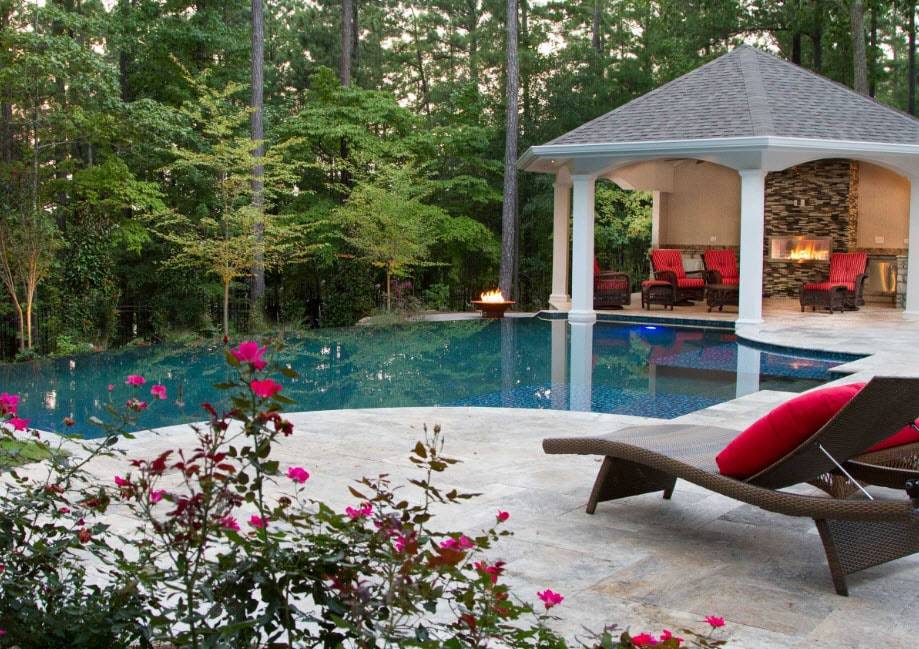 Площадка для активного отдыха, ограниченная каменными плитами, ровным газоном или террасной доской. Здесь лучше всего установить детские качели, бассейн, лавочки вокруг открытого костра или барбекю.