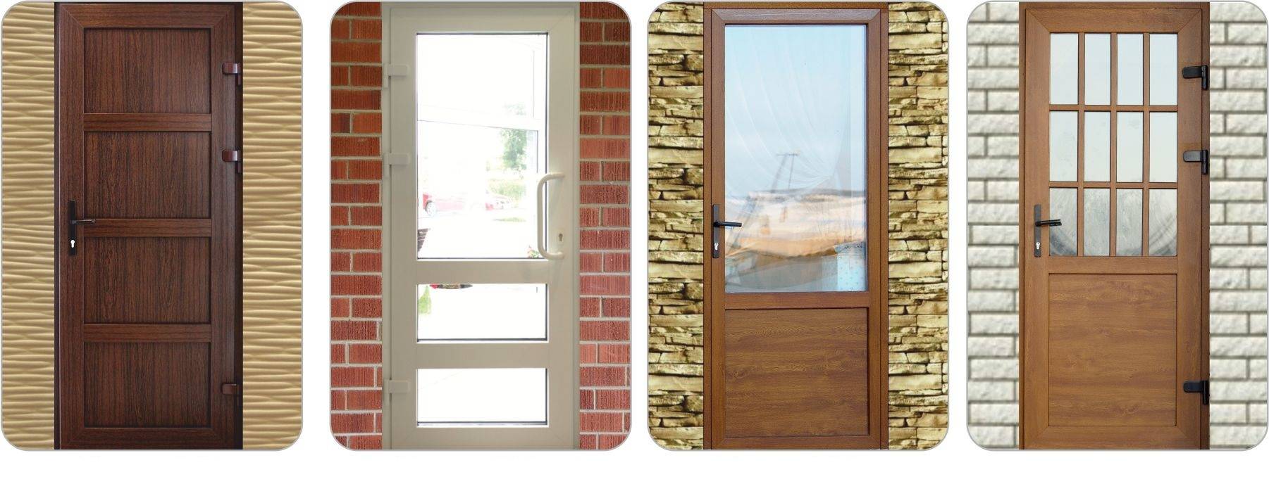 Представленные вариации возможны как в глухом исполнении, то есть со сплошным пластиковым полотном, или дополненные стеклянными панелями. При дизайне входных дверей применяют краску и ламинированные пленки на клейкой основе.