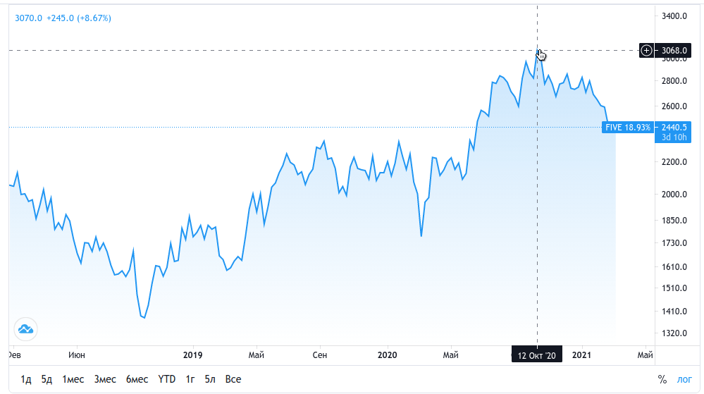 Пока цена в откате. После пандемичного пика возвращается к своим стабильным 2200—2400.