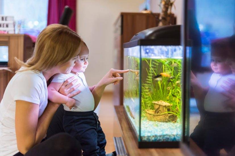 - Купите аквариум. Этой покупкой вы убьете сразу двух зайцев – зайца-ворчуна (по поводу низкой влажности в квартире) и зайца-эстета. Во-первых, аквариум это красиво, а безмятежное движение рыбок в нем успокаивает. Так говорят психологи. Если нет времени и желания кормить рыбок – оставьте там только водоросли. Есть интерьерные решения, не требующие постоянной смены воды и тщательного ухода за обитателями. А если влажность начнет превышать необходимые показатели, вы всегда сможете накрыть аквариум специально предусмотренной для этого крышкой.