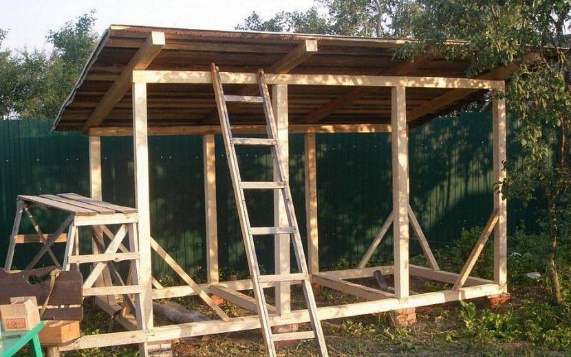 Когда каркас займёт своё место наступает очередь кровли. Верхняя часть вольера перекрывается стропильными ногами, на которые в дальнейшем потребуется приколотить доски обрешётки. Расстояние между балками зависит от сечения используемого материала. Для досок толщиной 50 мм и шириной 150 мм оптимальна разница в 60 см.