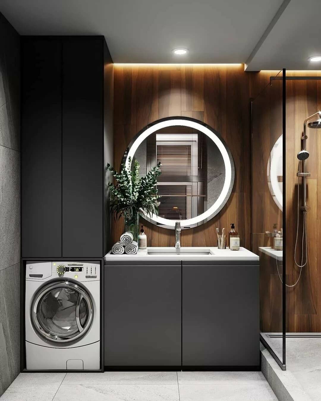 В больших помещениях хорошо смотрятся напольные шкафы-пеналы, размещенные симметрично, либо же один большой шкаф-купе, в котором будет место не только для косметических принадлежностей, но и для бытовой техники, такой как стиральная машинка.