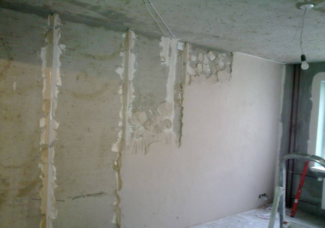 Если стены выравниваются в квартире с уже имеющимся старым ремонтом, с них требуется снять все материалы до капитальных стен.