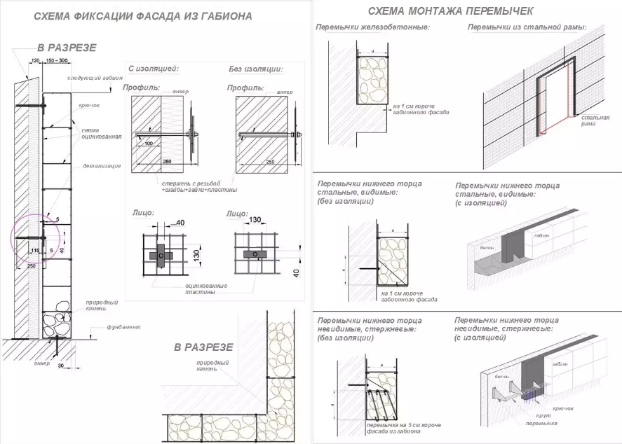 Однако максимальный диаметр вязальной проволоки 2.2 мм, поэтому надёжное крепление не гарантируется. Декоративные габионы лучше связывать заранее скрученными проволочными спиралями, которые создают более прочное соединение и выглядят эстетично. Зазоры, остающиеся при соединении стенок, разрешают габиону играть при морозном пучении грунта. Спирали изготавливаются из гладкостенной жёсткой низкоуглеродистой проволоки с диаметром минимум 3 мм.