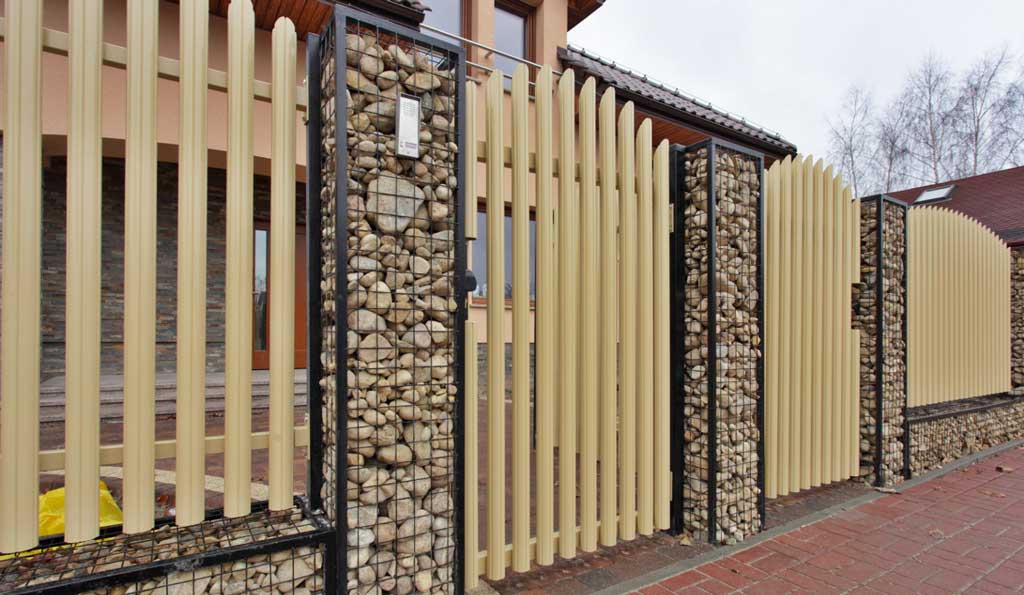 Эффектно смотрятся цилиндрические и сплошные габионы, собранные в виде традиционного забора. Полотно ограды создают из кованного металла или сетки. Основная декоративная нагрузка идет на крепления (столбики, основу). Нарочито грубые модули с насыпкой придают конструкции брутальность, при этом остаются близкими к природе.