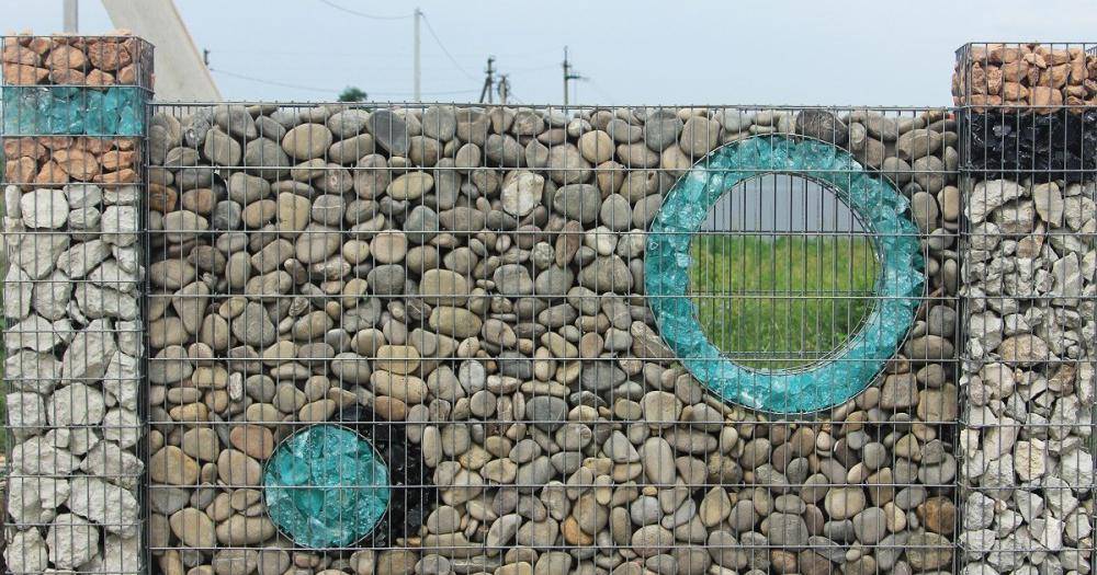 Ограду из камней часто делают сквозной. Частичное заполнение сетки сверху, сбоку или в центре позволяет создать эффект полупрозрачности. Пустые модули можно обернуть цветной проволокой. Забор из камней сочетается со всеми видами зелени, поэтому рядом высаживают живые растения.