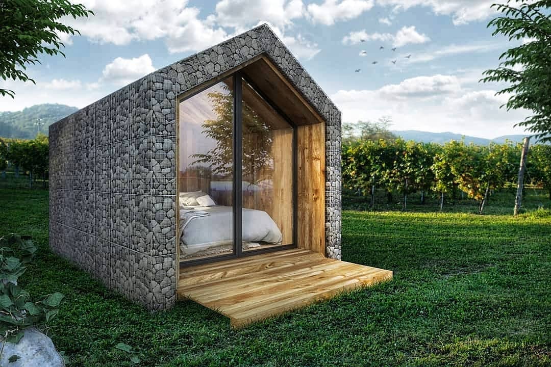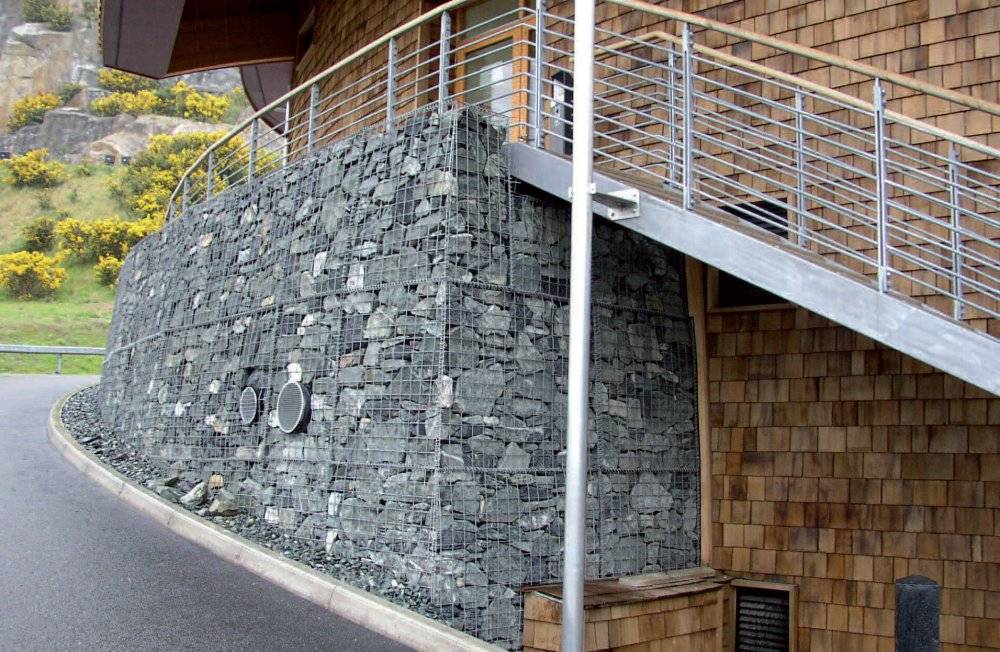Насыпные конструкции применяются и в малоэтажном строительстве. Габионы устанавливаются в качестве внешней обшивки фасада, используются для строительства и отделки колонн. Выглядит эффектно и необычно.
