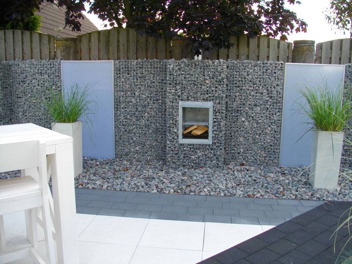 - Внешняя отделка уличных печей, грилей, барбекю, каминов габионами — одно из лучших решений. Ведь камни — материал с высокой теплоемкостью и абсолютно не горючий. Красивый грильУличная печь