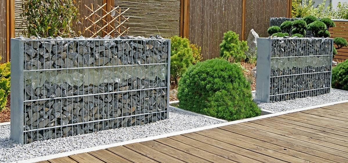 Можно чередовать живую изгородь и габионы: красивый куст, рядом сетчатая секция и снова куст. Там, где крупные ограды нежелательны, из габионов делают невысокие барьеры и даже бордюры.