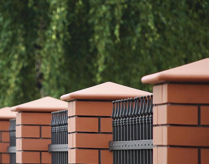 Обязательный элемент конструкции — колпаки на кирпичные столбы. Без них материал долго не простоит. Влага, замерзая в кирпиче, разрушит его. На рынке можно встретить колпаки двух видов – металлические и бетонные.