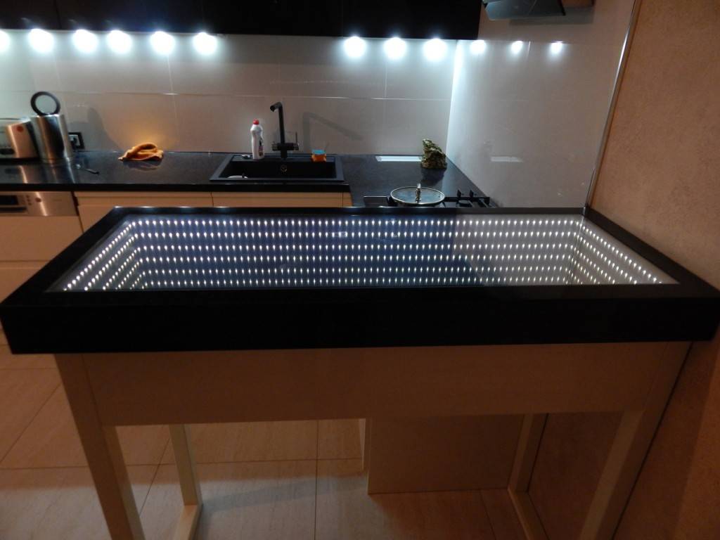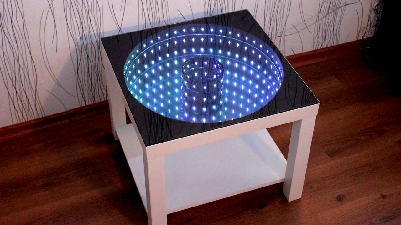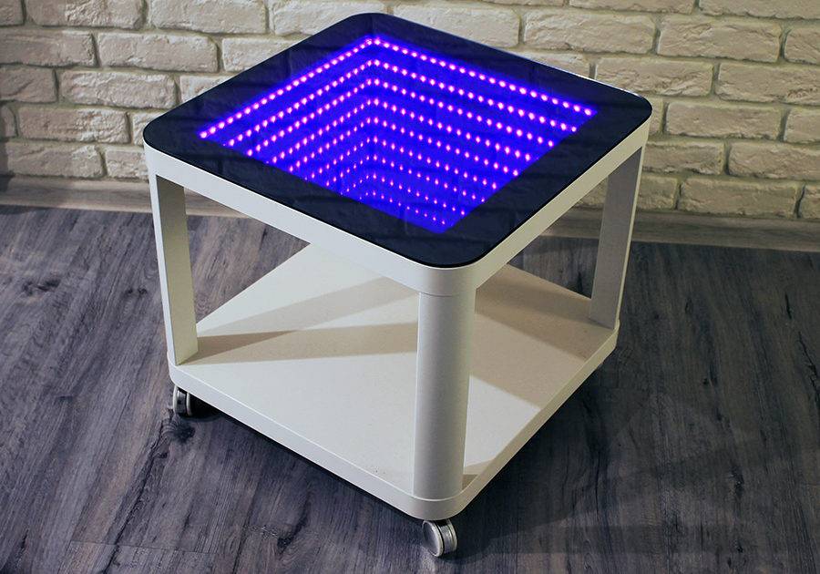 Если смотреть на стол с подсветкой, то можно представить, что в глубине существует портал в иное измерение. Для достижения подобного эффекта понадобятся всего 2 зеркала нужного размера и светодиоды, которые будут располагаться между ними. Цвет ламп при этом может быть любым. Включение стола со светодиодной подсветкой осуществляется при помощи пульта или небольшой кнопки. Лампы экономичны, долговечны и безопасны для человека и окружающей среды. Кроме того, можно делать подсветку из светодиодной ленты.