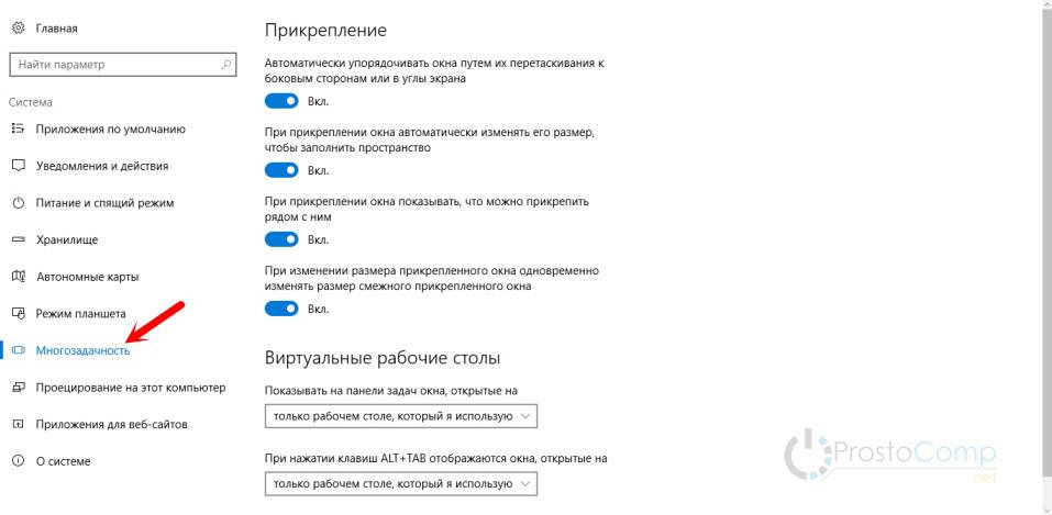 Настройки этой функции можно найти в Параметрах, в разделе Система, на вкладке «Многозадачность».