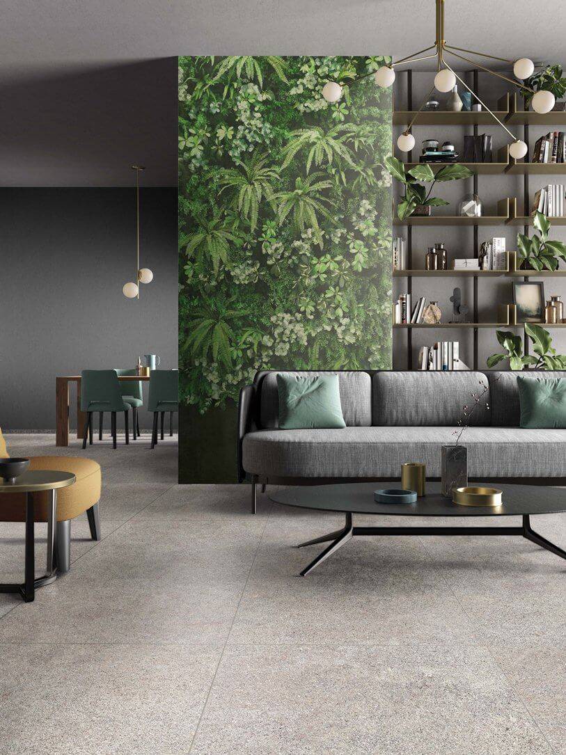 Если подразумевается подогрев пола или стиль требует минимального количества акцентов, то для отделки подойдет широкоформатный керамогранит, плитка или наливной вариант.