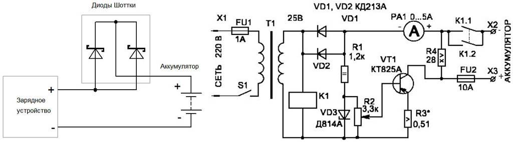 В общем, если нет необходимости спешить, лучше использовать заряд постоянным током. Если надо за короткое время восстановить работоспособность аккумулятора — подавайте постоянное напряжение. Если говорить о том, какое лучше сделать зарядное устройство для автомобильного аккумулятора своими руками, ответ однозначен — подающее постоянный ток. Схемы будут простые, состоящие из доступных элементов.