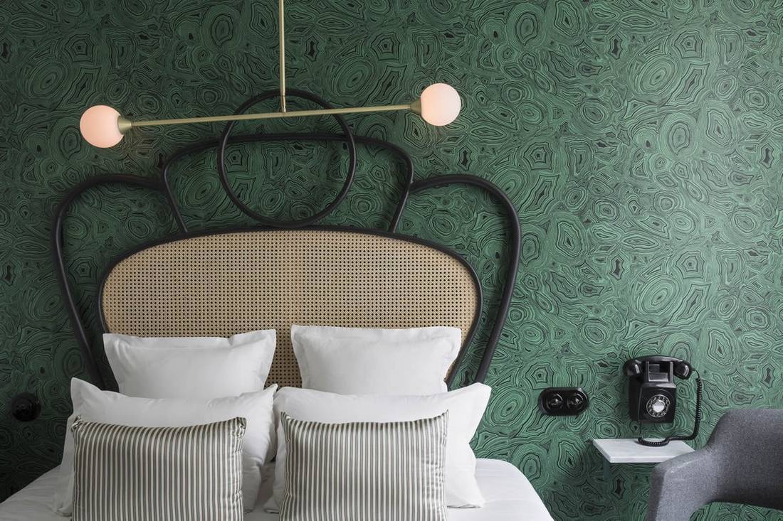 Яркие и насыщенные зеленые обои в спальне можно разместить в прикроватной зоне: здесь они будут создавать акцент, но не будут противоречить умиротворенной обстановке в интерьере.