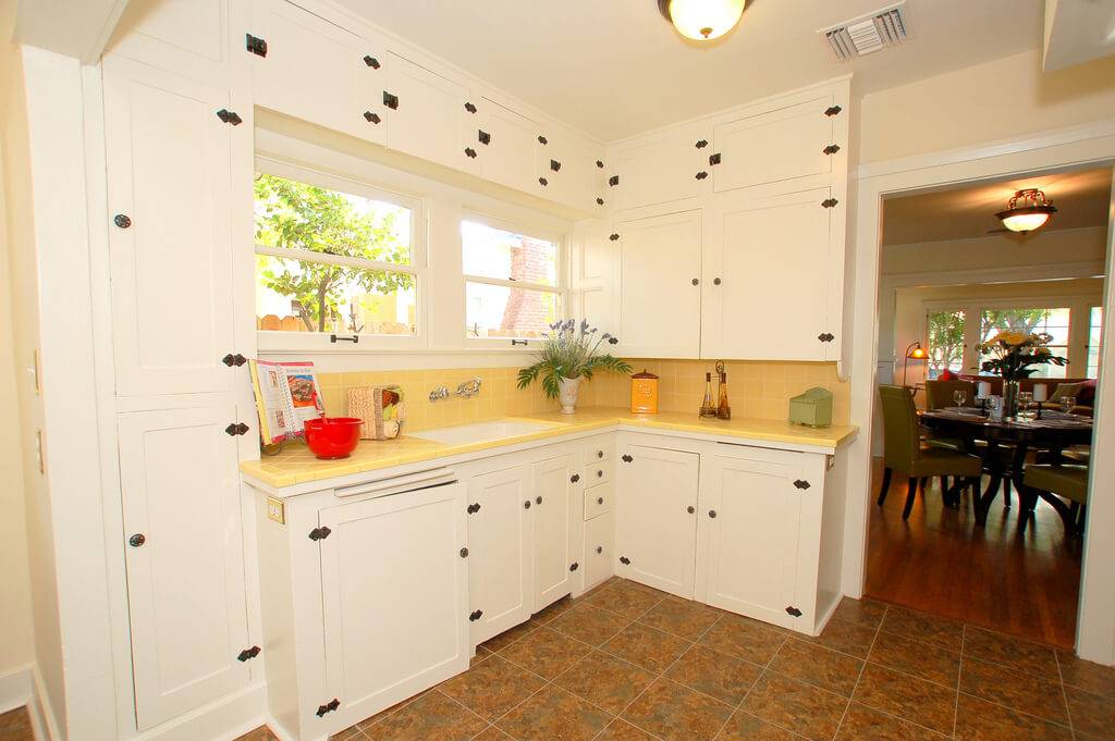 Белый кухонный дизайн с кремово-желтым фартуком.